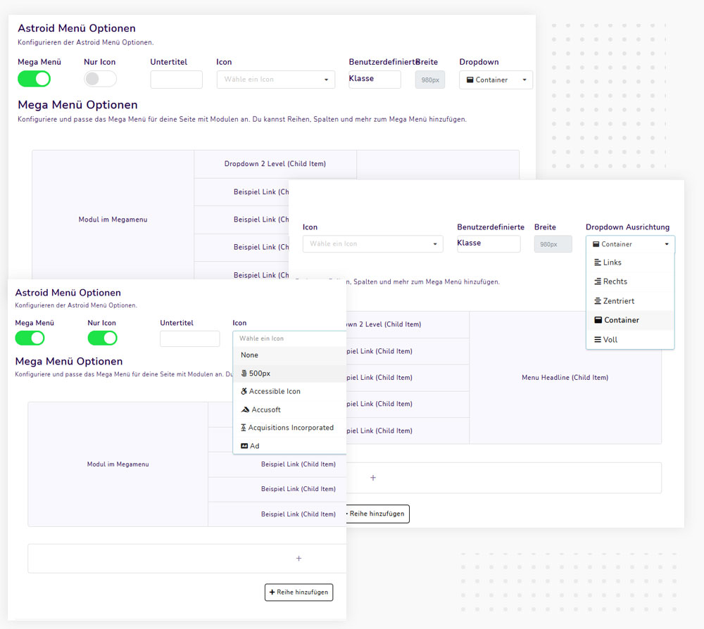 Das framework wird mit einem Mega-Menü-Builder per Drag & Drop geliefert. Sie können Ihre Menüpunkte und Joomla-Module hinzufügen und ein interaktives Mega-Menü erstellen.